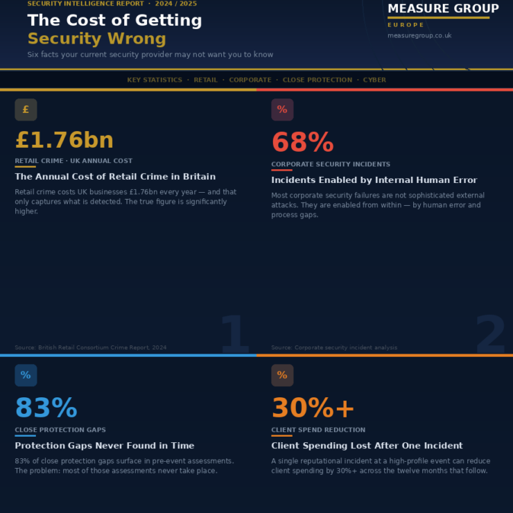 £1.76bn — estimated annual cost of retail crime in the UK (British Retail Consortium, 2024) 68% of security incidents in corporate environments are enabled by internal human error, not external attack 83% of close protection gaps are identified not during incidents, but in pre-event threat assessments that never took place.